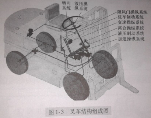 叉車主要由動力裝置、底盤、工作裝置和電氣設(shè)備四大部分組成,如下圖1-3所示。