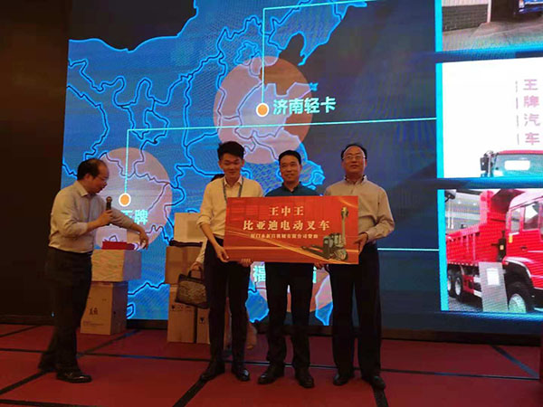 2018年10月15日,全國集運(yùn)年會在廈勝利召開暨廈門現(xiàn)代物流商會二屆二次會議中秋晚會順利舉行!廈門永新昌機(jī)械設(shè)備有限公司贊助二臺比亞迪小鋰電動叉車!恭喜中國重汽,段先生!獅翔物流有限公司何先生喜各得一臺比亞迪叉車!