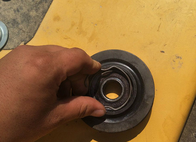 第五步:壓卡環(huán)‘裝皮帶。用手把卡環(huán)壓回去,來回轉一下,確認有沒有進入卡環(huán)槽;然后掛好皮帶,調整皮帶緊張度。