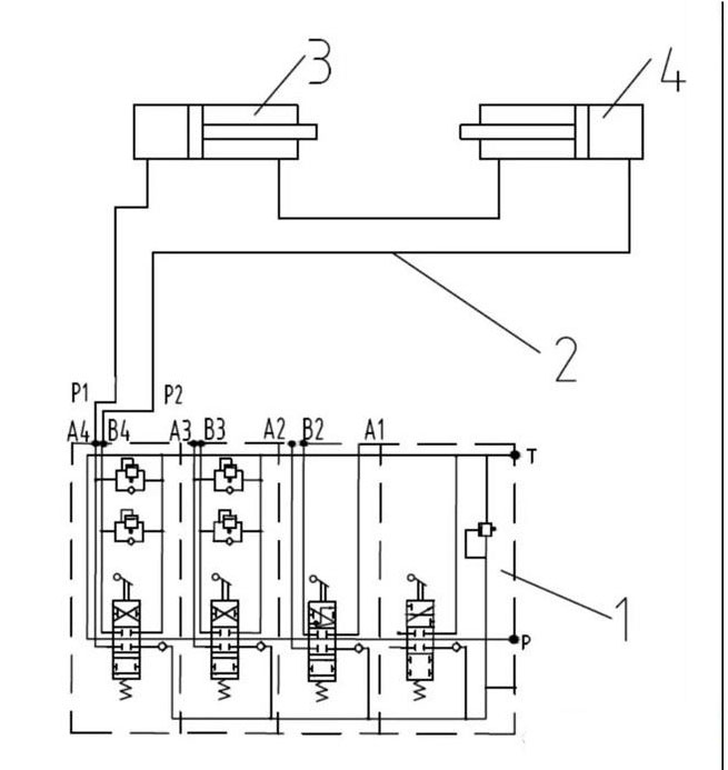 為解決現(xiàn)有4片換向閥不能滿足掛裝復(fù)雜屬具問(wèn)題,經(jīng)研究我們決定對(duì)門(mén)架液壓回路進(jìn)行改進(jìn),即在現(xiàn)有換向閥組1的第4片換向閥管路上增加1個(gè)二位六通電磁閥3,以增加1個(gè)屬具缸5動(dòng)作需求。改進(jìn)后門(mén)架液壓回路如圖2所示。圖2中的管路(2、4)用于連接二位六通電磁閥3和屬具缸5。