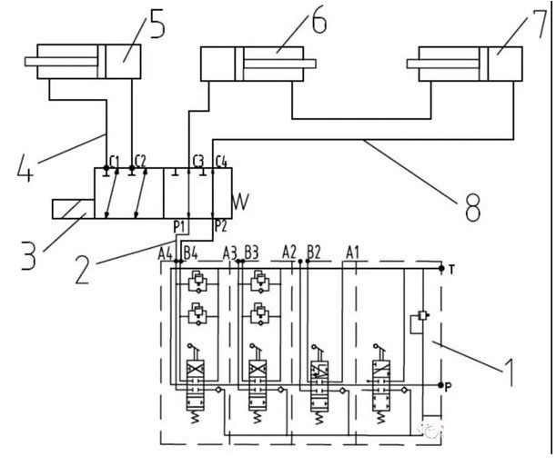 圖2改進(jìn)后門(mén)架液壓回路 1.換向閥組2、4、8.管路 3.二位六通電磁閥5.屬具缸6、7.側(cè)移缸