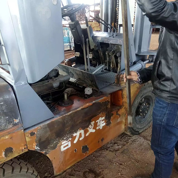 5、不以標準叉車來比對參數:如輪胎型號、門架結構、配重(實鐵的用錘子敲的時候聲音“丁丁”;水泥的只是鐵皮包圍,中間是水泥,鐵錘敲的時候聲音“咚咚”)和車架不能分離。