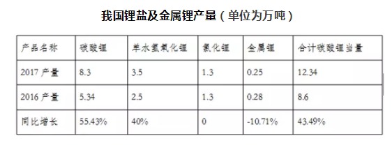 根據(jù)中國有色金屬工業(yè)協(xié)會(huì)鋰業(yè)分會(huì)初步統(tǒng)計(jì),2017年全球鋰鹽產(chǎn)量為23.54萬噸(碳酸鋰當(dāng)量),同比增長21.5%,我國鋰鹽產(chǎn)量12.34萬噸(包括進(jìn)口工業(yè)級碳酸鋰加工成電池級碳酸鋰或氫氧化鋰等),同比增長43.5%。