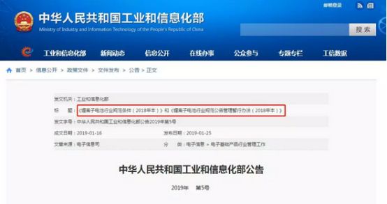 《鋰離子電池行業(yè)規(guī)范條件(2018年本)》和《鋰離子電池行業(yè)規(guī)范公告管理暫行辦法(2018年本)》,已于2019年2月15日起正式施行。