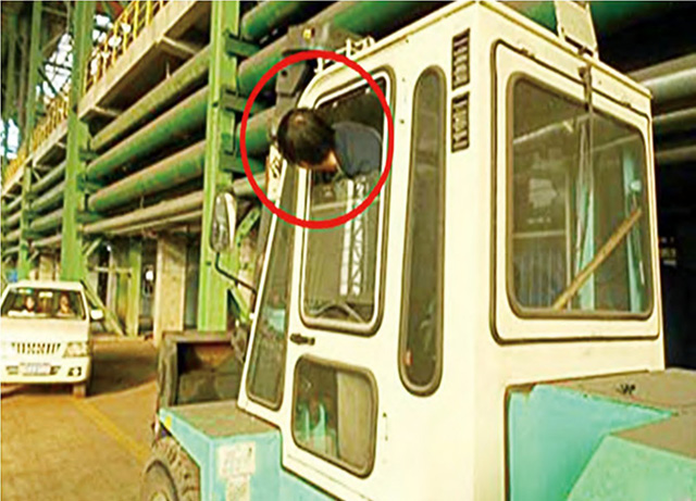 叉車作業(yè)時(shí)駕駛員將身體探出車體的外輪廓線或?qū)⑹直鄣壬眢w部位露出護(hù)頂架外。根據(jù)《機(jī)動(dòng)工業(yè)車輛 安全規(guī)范》14.2.3.1:車輛運(yùn)行時(shí),駕駛員不得將身體探出車體的外輪廓線。