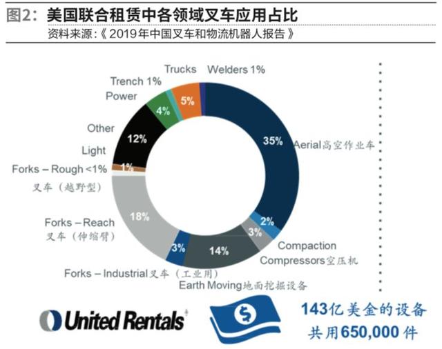 租賃(通常稱為經(jīng)營(yíng)性租賃)是一種設(shè)備的出租行為,是借助于融資租賃和其他金融行為直接或間接取得租賃資產(chǎn),再出租設(shè)備和服務(wù)的一種模式,通常是賺取設(shè)備殘值和服務(wù)的利潤(rùn),具有共享屬性的設(shè)備更多采取該方式。全球最大的設(shè)備租賃企業(yè)——美國(guó)聯(lián)合租賃是Rental模式的代表,《2019年中國(guó)叉車和物流機(jī)器人報(bào)告》列出的美國(guó)聯(lián)合租賃的65萬(wàn)件租賃資產(chǎn)明細(xì)中,應(yīng)用于工業(yè)物流領(lǐng)域的叉車占比為3%,戶外越野類和伸縮類叉車占比19%(見(jiàn)圖2)。