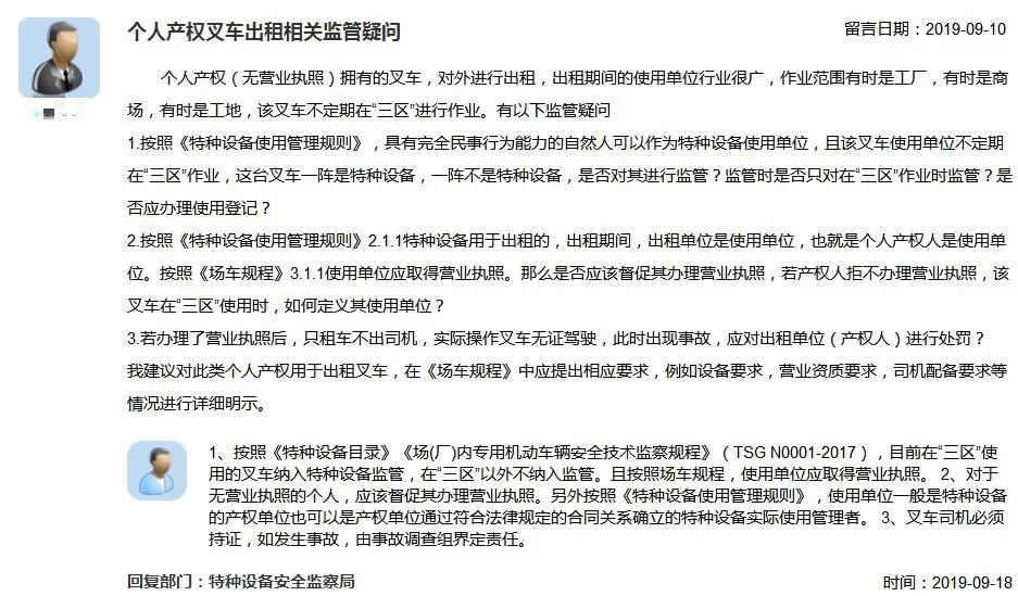 問:個(gè)人產(chǎn)權(quán)(無營業(yè)執(zhí)照)擁有的叉車,對(duì)外進(jìn)行出租,出租期間的使用單位行業(yè)很廣,作業(yè)范圍有時(shí)是工廠,有時(shí)是商場(chǎng),有時(shí)是工地,該叉車不定期在“三區(qū)”進(jìn)行作業(yè)。有以下監(jiān)管疑問