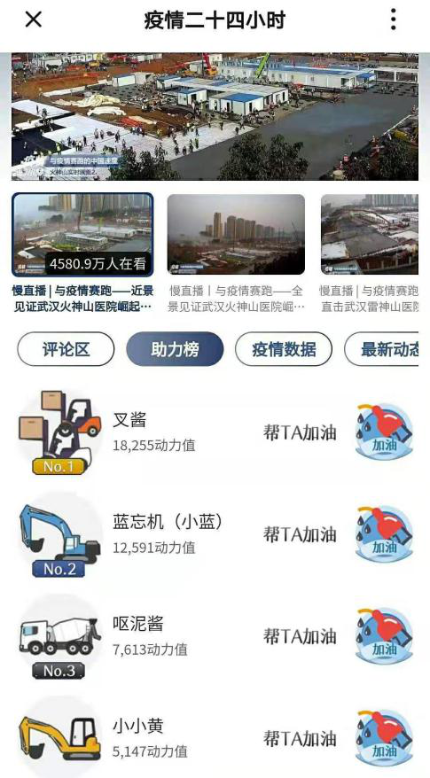 由于工期緊張,期間動(dòng)用了大量建筑設(shè)備,央視十分給力為大家提供了兩座醫(yī)院的建造實(shí)況直播,無數(shù)網(wǎng)友涌入直播間為武漢加油打氣,成為“云監(jiān)工”為施工現(xiàn)場助力,甚至為努力工作中的工具車們起名叉醬、鏟醬等可愛的昵稱。
