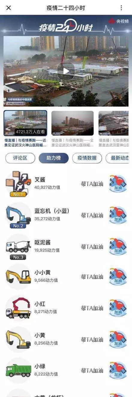 其中,火神山和雷神山醫(yī)院的24小時(shí)直播建造,更是吸引了超過1.13億人次的“云監(jiān)工”。網(wǎng)友除了盛贊中國(guó)速度之外,還給各施工隊(duì)的“愛將”們挨個(gè)取了“可愛”的昵稱: