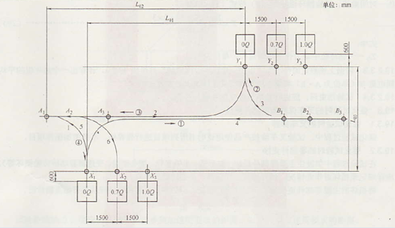 叉車強(qiáng)化試驗(yàn)場地需要專業(yè)布置及特定運(yùn)行路線,以電動(dòng)平衡重式叉車強(qiáng)化試驗(yàn)為例,空托盤、輔助試驗(yàn)載荷0.7Q和試驗(yàn)載荷Q,分別置放在場地特定位置X1、X2、X3處,試驗(yàn)過程中的負(fù)荷分配量分別占20%、50%和3o%;中貨位起升,在X1、X2、X3處,起升高度為2/3H;高貨位起升,在Y1、Y2、Y3處,起升高度為1.0H。試驗(yàn)過程中的起升高度分配量各占50%。中貨位起升,在凡、凡和朽處,起升高度為⒉3刃;高貨位起升,試驗(yàn)過程中的起升高度分配量各占50%。