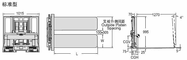 | Capacity 承載能力(kg) | Catalog Order NO 型號 | Mounting Class 安裝等級 | Type類型 | Platen Size (H x W)叉板尺寸 W x L(mm) | Outside Platen Spacing叉板外側(cè)間距(mm) | Vertical Center of Gravity垂直重心CGV(mm) | minimum track carriage width叉車貨叉架寬度最小值(mm) | Weight 自重(kg) | Effective 失載距ET(mm) | Horizontal Center of Gravity 水平重心CGH(mm) |