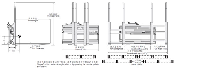 | Capacity 承載能力(kg) | Catalog Order NO 型號(hào) | Mounting Class 安裝等級(jí) | Load Center載荷中心(mm) | Pallet Type托盤(pán)類(lèi)型 | Minimum Truck Carriage Width叉車(chē)貨叉架寬度最小值(mm) | Frame Width框架寬度(mm) | Vertical Center of Gravity垂直重心VCG(mm) | Opening Range ITI內(nèi)貨叉張距ITI(mm) | Opening Range OTO外貨叉張距OTO(mm) | Avg.Pallet Spread平均托盤(pán)張距(mm) | Fork Set Spread貨叉凈張距(mm) | Fork Size貨叉長(zhǎng)度×寬×厚 L×W×T (mm) | Backrest Height擋貨架高度 | Weight 自重(kg) | Effective 失載距ET(mm) | Horizontal Center of Gravity 水平重心CGH(mm) |