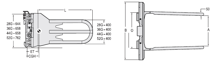 | Capacity 承載能力(kg) | Catalog Order NO 型號(hào) | Mounting Class 安裝等級(jí) | Opening Range張臂范圍A(mm) | Frame Width框架寬度B(mm) | Arm Height臂高H(mm) | Arm Length臂長(zhǎng)L(mm) | Minimum Truck Carriage Width叉車貨叉架寬度最小值O(mm) | Weight 自重(kg) | Effective 失載距ET(mm) | Horizontal Center of Gravity 水平重心CGH(mm) |
