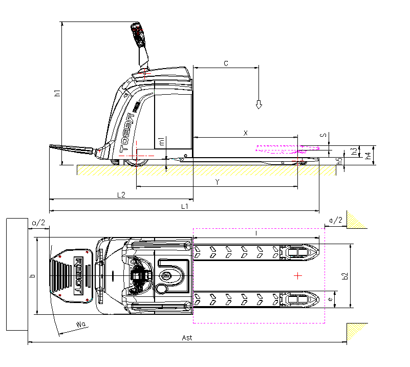 | 直角堆垛通道寬度,托盤(pán)1000x1200(1000沿貨叉邊) | Ast mm | 2665 | |||