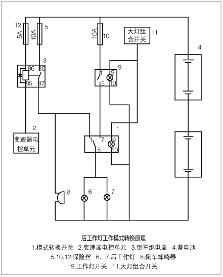 該叉車后工作燈控制原理如附圖所示,其主要由模式轉(zhuǎn)換開關(guān)1、變速器電控單元2、倒車?yán)^電器3、蓄電池4、保險絲(5、10、12)、后工作燈(6、7)、倒車蜂鳴器8、工作燈開關(guān)9、大燈組合開關(guān)11等組成。其工作過程如下: