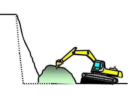 (4)挖機(jī)需要將作面最下方殘留的堅硬部分進(jìn)行挖掘作業(yè)。此外,還需將挖掘下來的碎石盡量收攏到石堆上。